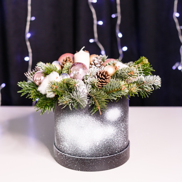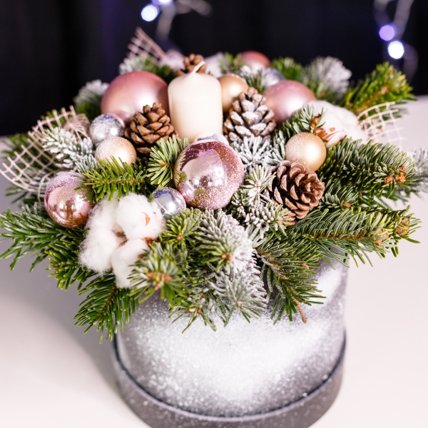 Informatii despre Cutie cu aranjamente de Craciun: brad, bumbac, ornamente roz