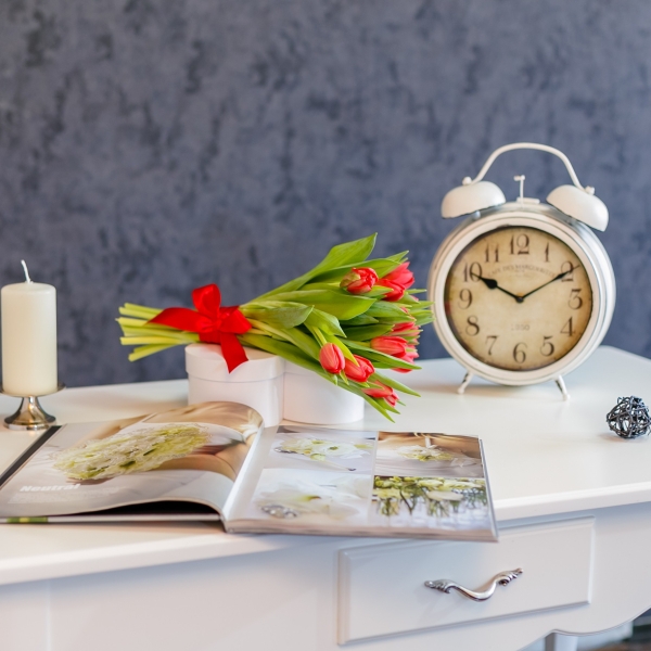 Comanda online pentru persoanele dragi un buchet de lalele, format din 15 lalele rosii cu panglica de matasa rosie. Inaltimea buchetului este de 40 cm, iar diametrul de 20 cm.