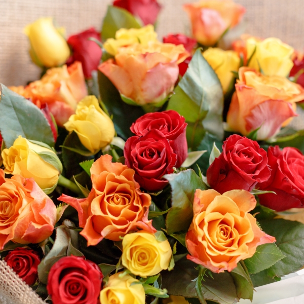 Buchet 19 Trandafiri Mix Orange poate fi surpriza care sa incante persoana draga. Compus din 19 trandafiri Olanda Ecuador de culoare galben, orange, rosu cu dimensiune 40-60 cm, ambalat cu hartie naturala si tish, decorat cu panglica de satin si organza.