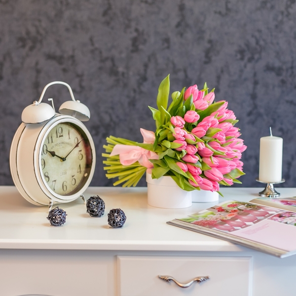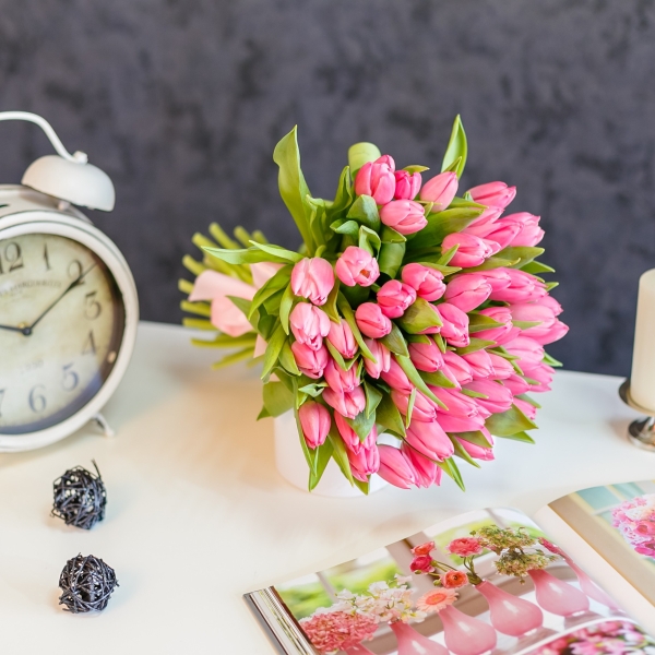 Fa-i ziua remarcabila trimitandu-i la usa curierul cu un Buchet de lalele roz. Buchetul va contine 51 fire si o panglica de satin. Marimea este de 35-45 cm.