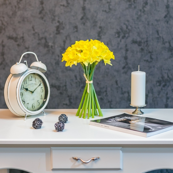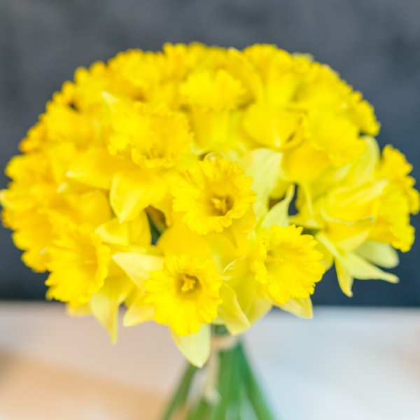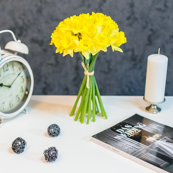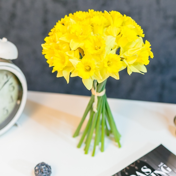 Acest deosebit buchet din 21 narcise poate fi surpriza care să încânte persoana dragă. Fiecare buchet este livrat într-un mod special: în costum, mănuși albe și papion roz. La el atașăm un pliculeț cu Chrysal: substanța care va menține proaspete florile alese de dumneavoastră și un card de felicitare gratuit, pe care imprimăm mesajul dorit. Componeță: Narcise, Rafie Dimensiuni: Înălțime 30 cm, Diametru 20 cm