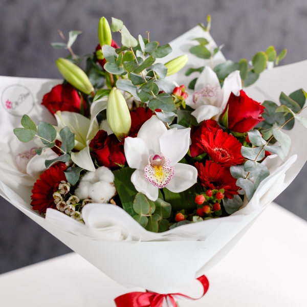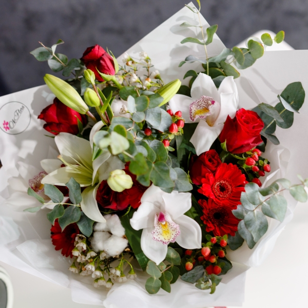 Buchet Alb-Rosu poate fi surpriza care sa incante persoana draga. Compus din 3 orhidei, 3 gerbere, 5 trandafiri, 1 crin, 3 hypericum, 3 waxflower, 3 floricele de bumbac si eucalipt,  cu diametru de 30-40 cm, ambalat cu hartie alba cartonata si decorat cu panglica de satin.