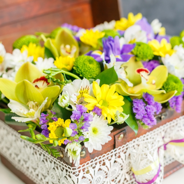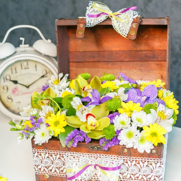 Această deosebită Lădiță cu Flori Mixte poate fi surpriza care să încânte persoana dragă. Fiecare compoziție este livrată într-un mod inteligent: în costum, mănuși albe și papion roz. La el atașăm un pliculeț cu Chrysal: substanța care va menține proaspete florile alese de dumneavoastră și un card de felicitare gratuit, pe care imprimăm mesajul dorit. Înăuntrul fiecărei cutii este bureta specială - oasis, care va menține florile dumneavoastră proaspete. Dimensiuni: Înălțime 20 cm. Lățime 20 cm, Lungime 30 cm Componență: Orhidei, Statiță, Crizanteme