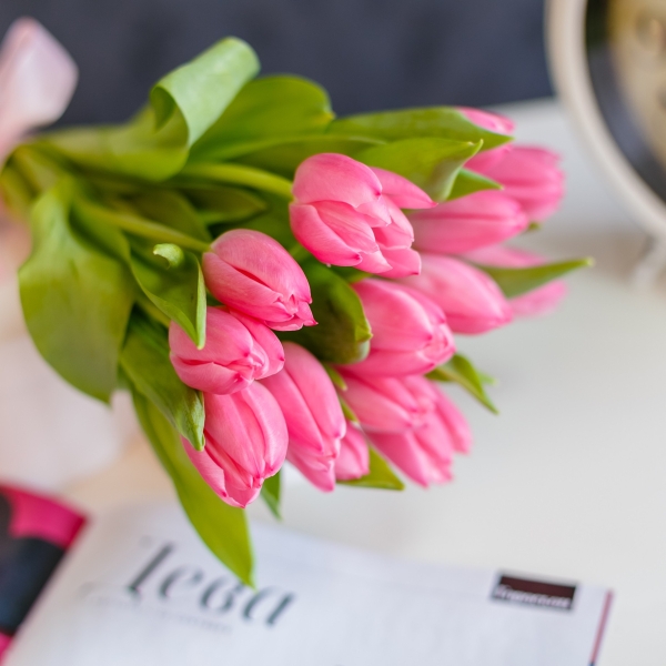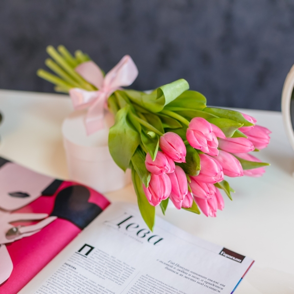 Acest buchet unic de Lalele poate fi surpriza care poate incanta persoana iubita. Componente: Lalele, Panglica Satin Dimensiuni: Inaltime 40 cm; Diametru 20 cm