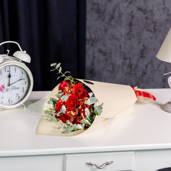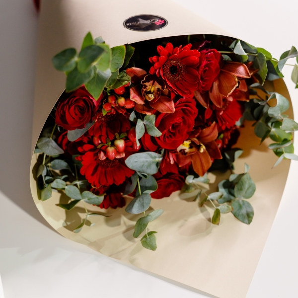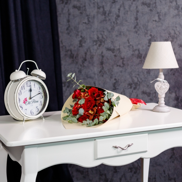 Buchetul din flori mixte care cuprinde frumusețea naturii într-o singură unitate! Unele flori din buchet sunt sezoniere și pot fi înlocuite cu altele similare, la discreția floristului. Vom depune efort pentru ca culorile și forma compoziției să corespundă cu cele ilustrate în imagine. Fiecare buchet este livrat într-un mod special: în costum, mănuși albe și papion roz. La el atașăm un pliculeț cu Chrysal: substanța care va menține proaspete florile alese de dumneavoastră și un card de felicitare gratuit, pe care imprimăm mesajul dorit. Componenţă: 7 Trandafiri, 7 Gherebere, 3 Hypericum, Orhidee Cymbidium Dimensiuni: Înălţime 50 cm, Diametru 25-30 cm